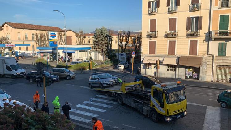 Incidente in via Oberdan a Brescia: quattro auto coinvolte, traffico in tilt